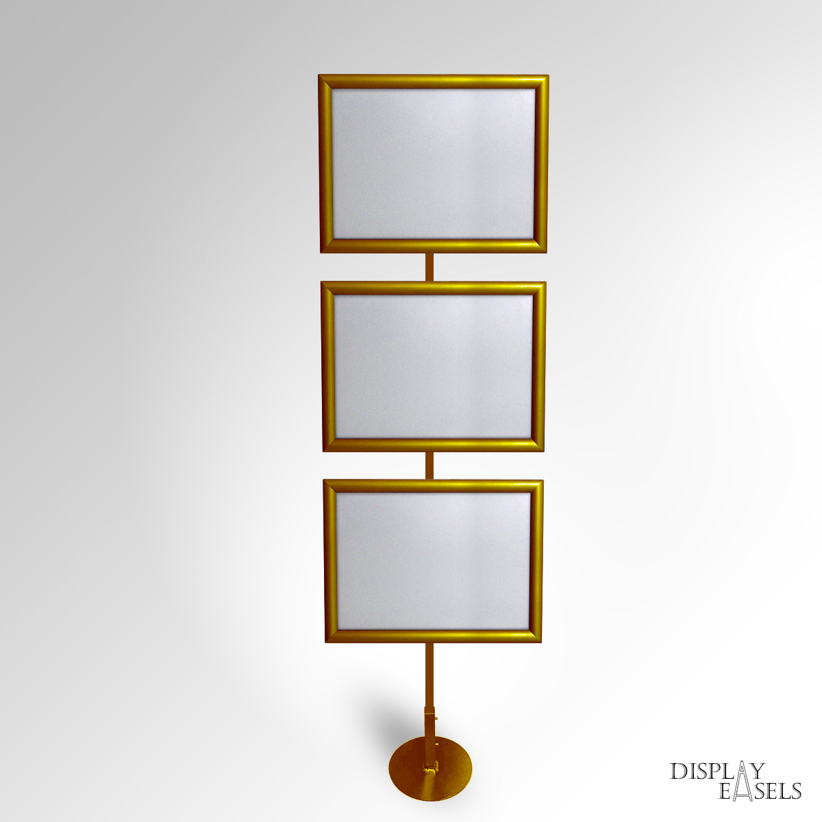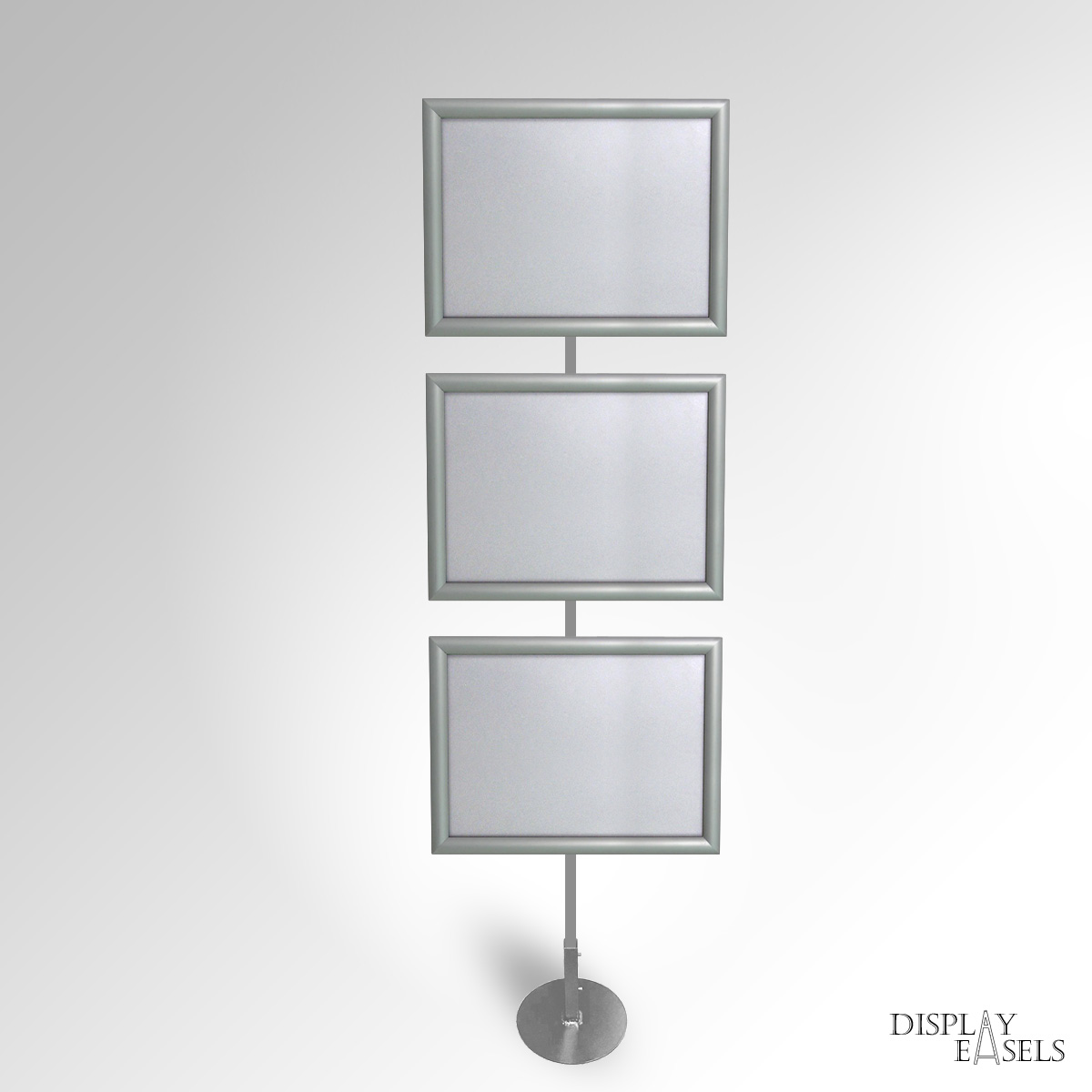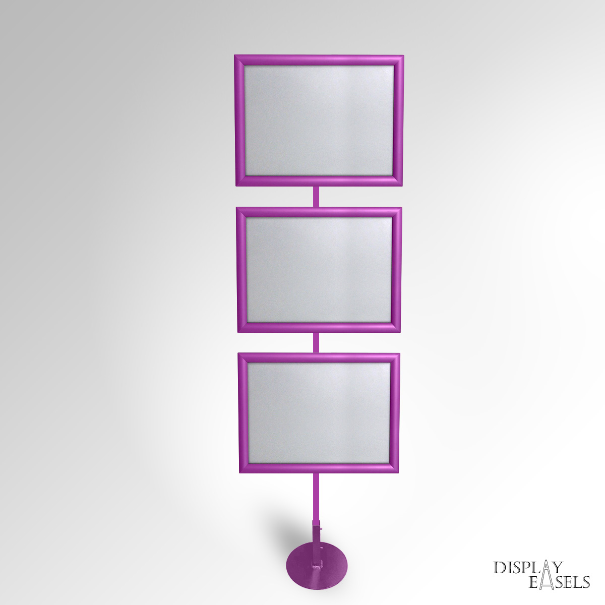 Floor Standing A3 Sign Stand is ideal for expos & corporate events indoor & outdoor use. A3 Click Snap Frames mounted on a durable, heavy-duty square tubular steel display stand. The Signage Stand can have 1 to 3 Poster Frames in a single-column display. Click Snap Frames can mount posters quickly with front-loading. Each poster frame also has an Anti-Glare PVC Film that helps protect any materials from dust or water damage. Very popular for Expo Exhibition & Info Points. Manually rotate frames between Portrait & Landscape orientation as required. Remove the poster frames, and use the metal stand to hang framed or unframed Artwork using the same Frame Hanging Fixtures. Available in Custom colours. Stock colours: SILVER, BLACK, WHITE, GOLD, BROWN, RED, PINK.