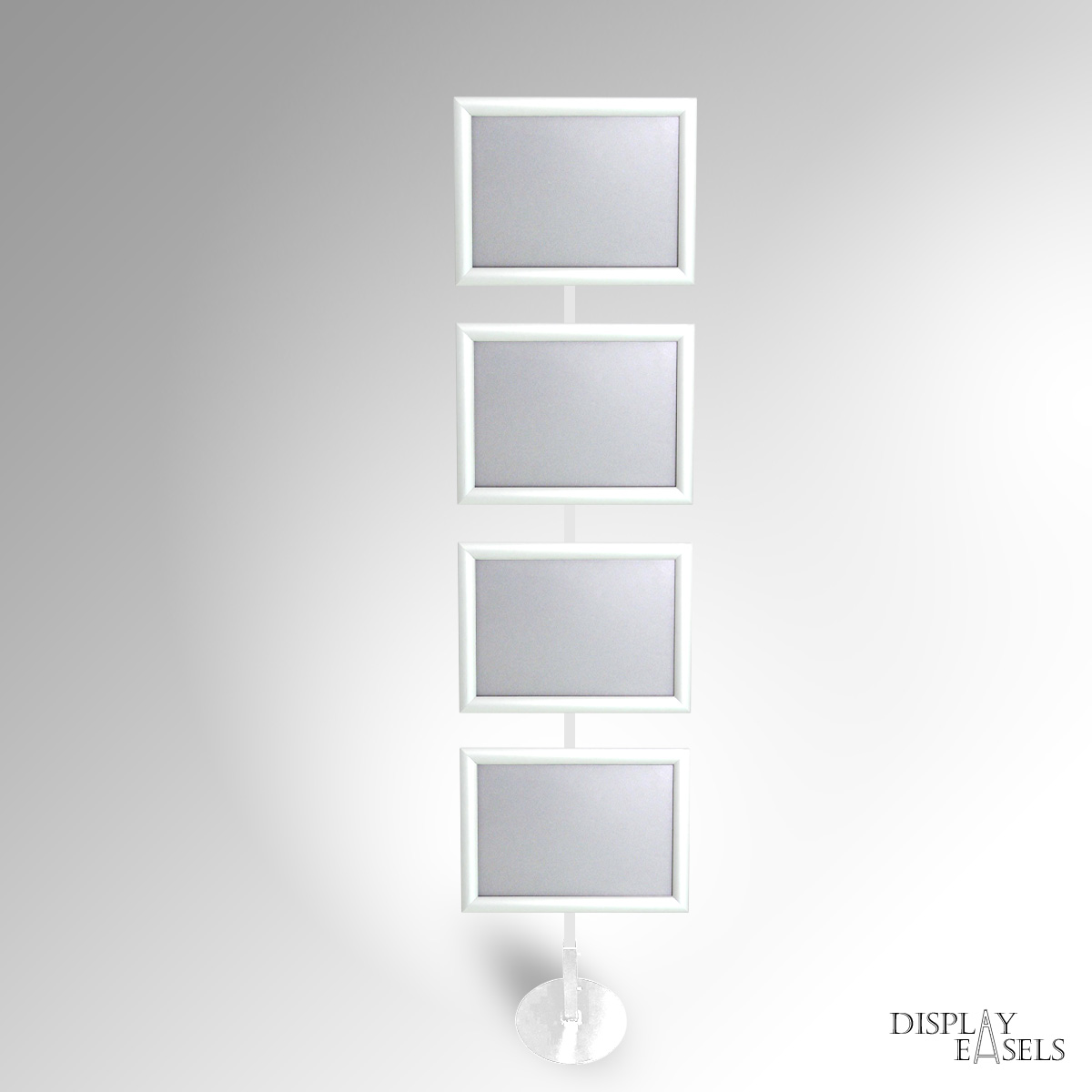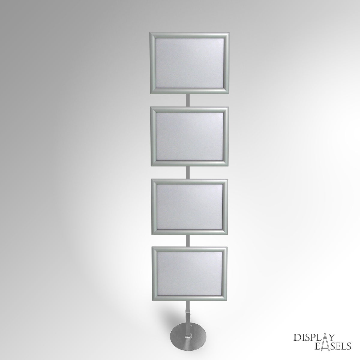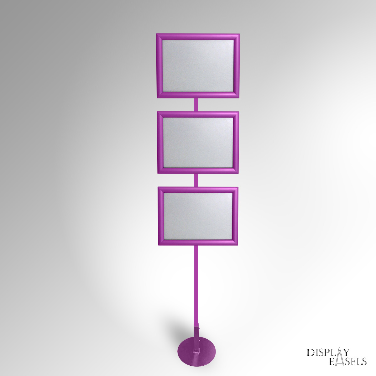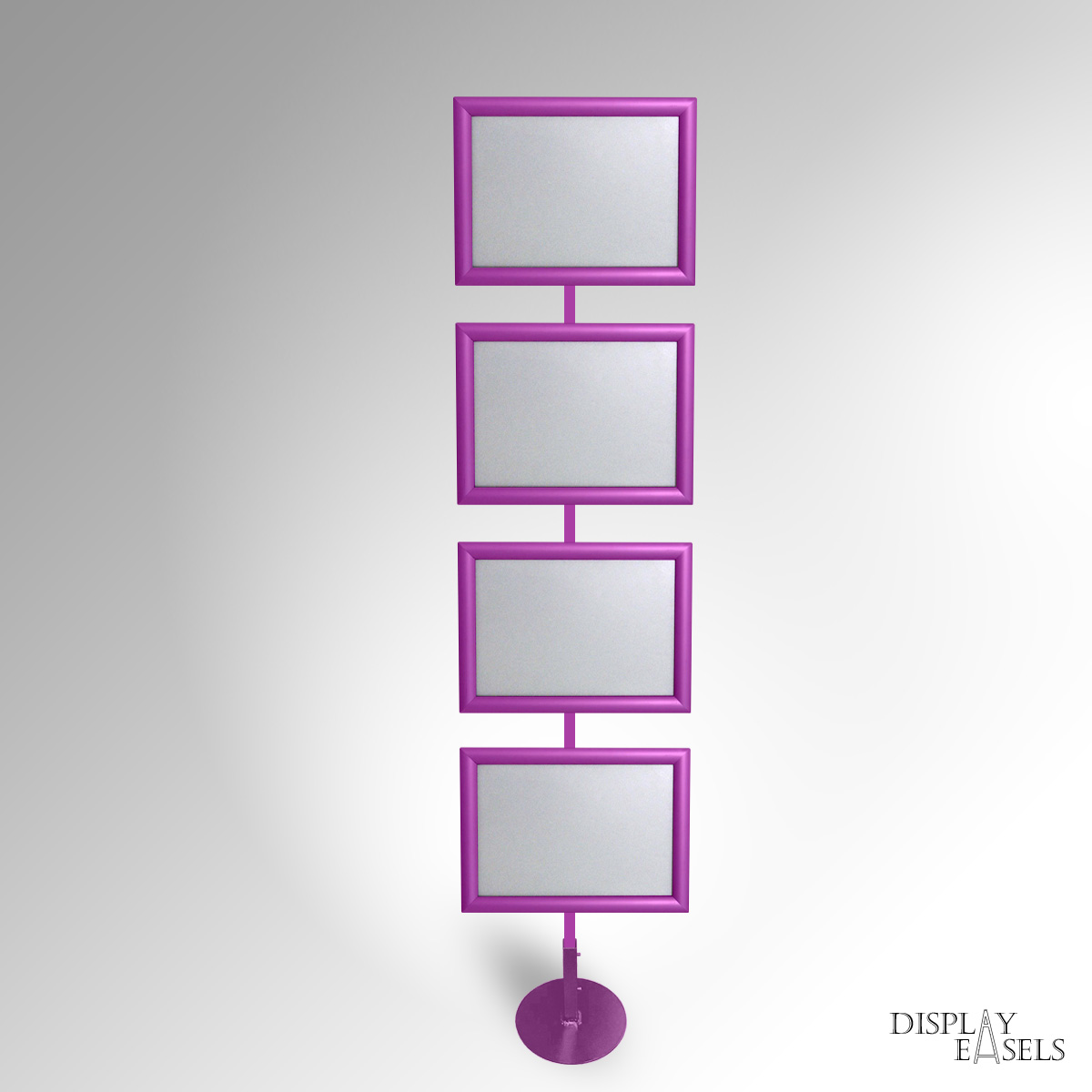 Floor Standing A4 Sign Stand is ideal for expos & corporate events indoor & outdoor use. A4 Click Snap Frames mounted on a durable, heavy-duty square tubular steel display stand. The Signage Stand can have 1 to 4 Poster Frames in a single-column display. Click Snap Frames can mount posters quickly with front-loading. Each poster frame also has an Anti-Glare PVC Film that helps protect any materials from dust or water damage. Very popular for Expo Exhibition & Info Points. Manually rotate frames between Portrait & Landscape orientation as required. Remove the poster frames, and use the metal stand to hang framed or unframed Artwork using the same Frame Hanging Fixtures. Available in Custom colours. Stock colours: SILVER, BLACK, WHITE, GOLD, BROWN, RED, PINK.