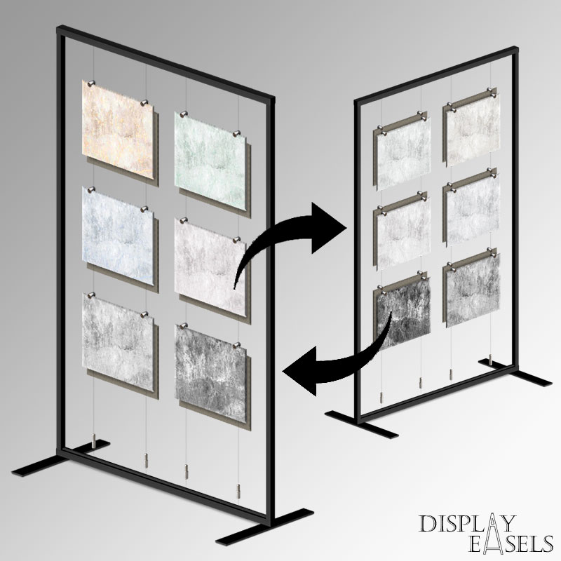 The Free Standing Tile Sample Stand is a double-sided expo display rack with mounted steel cables to showcase tiles, plates, marble, flat slate & building material samples. Hire or buy this heavy-duty tile rack – ideal for indoor & outdoor events, exhibitions and galleries. This unique tile display stand can present product samples in the middle of the room by exploiting its double-sided back-to-back design. You can hang any size & weight of materials up to 10mm thickness.