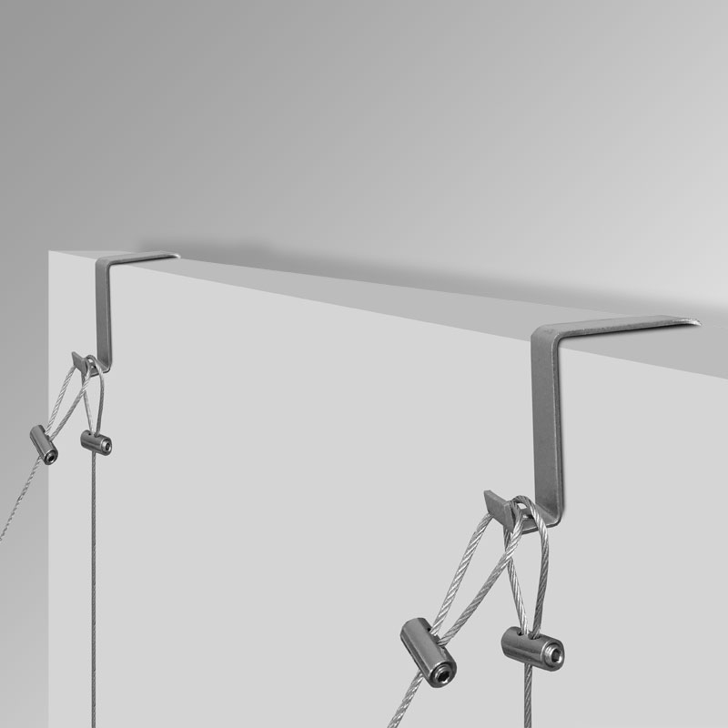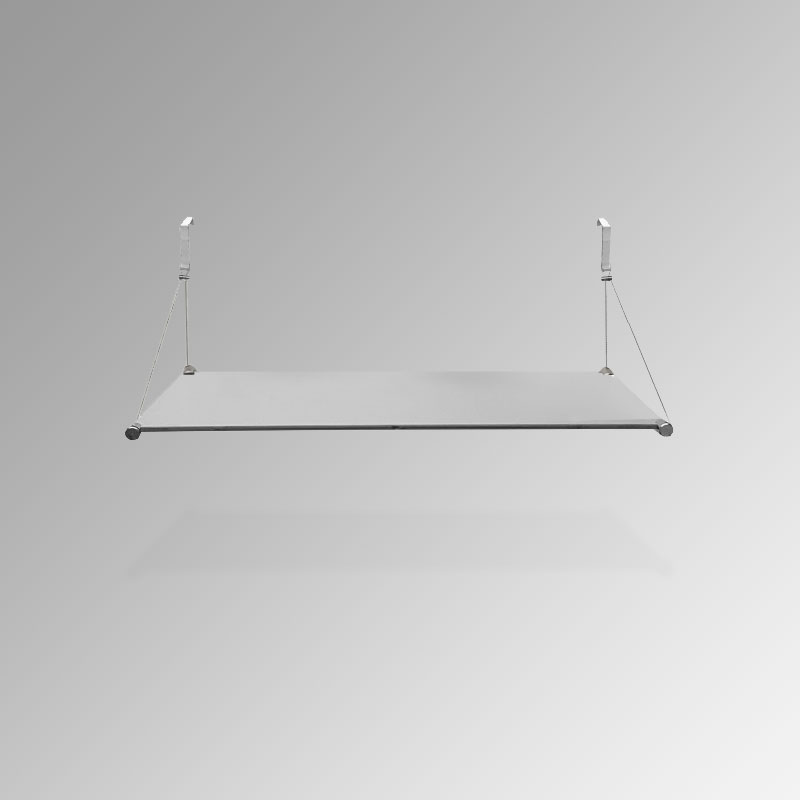Glass shelf for Partitions & Screens. Temporary Wall Shelving Units. Perfect for hanging shelves on room partitions. No Drill No Screws No Damage. Glass shelving suspended on cables. Customize & freely adjust position of each shelf. Shelf can be added or removed completely. Cables hook over panel without screwing. Ideal solution for offices, or events with expo screens & art panels. Toughened Safety Glass. Clear or Frosted shelf boards, in various sizes. Each glass shelf supports 20KG. Temporary Wall Shelving Kits include one, two, three, or four glass shelves.