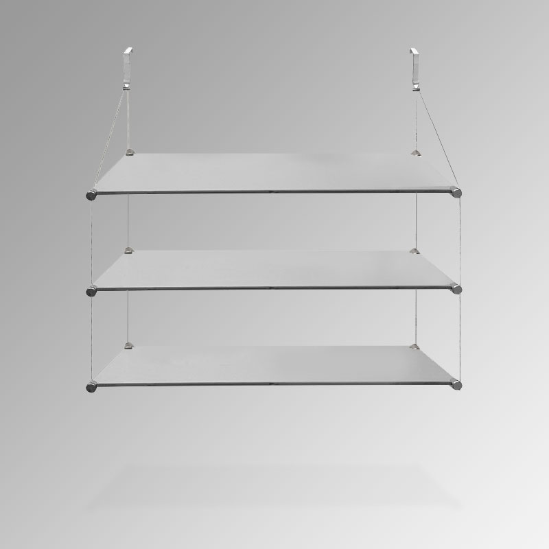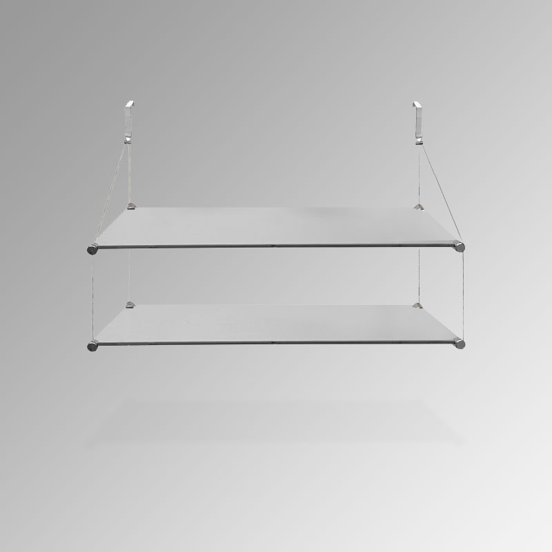 Temporary Glass Shelves for screens & partitions. Suspended glass shelf units. No Screws No Drill No Damage. Clear or Frosted Safety Glass Included. Available in various sizes. Up to 4 Glass Shelves in one kit.